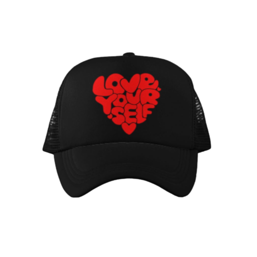Our Love Yourself Trucker Hat is a must-have accessory for any fashion-forward individual. Made with a breathable mesh back and adjustable snap closure, it offers both comfort and style. Show your self-confidence and spread positivity with this unique hat design.