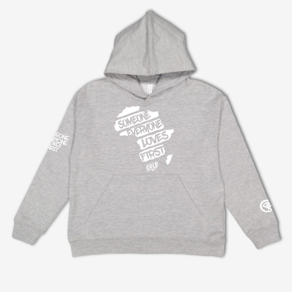 Our trademark motherland design features the color white on a Hooded Sweatshirt.