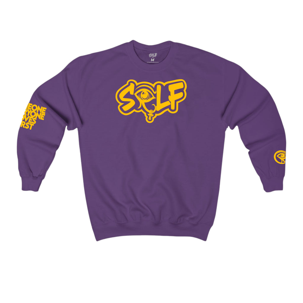 Our trademark design features the color gold on a premium purple 50/50 Crewneck Sweatshirt.