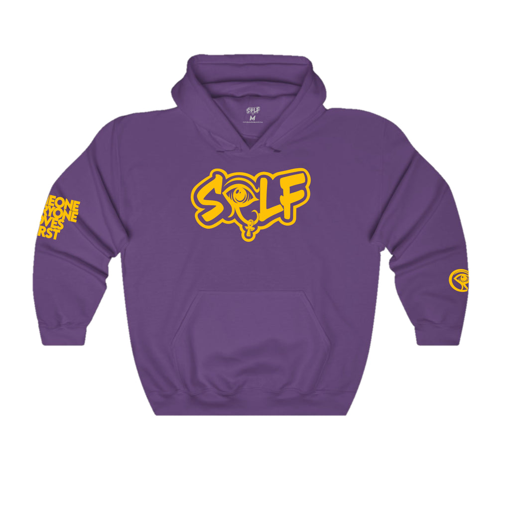 Our trademark design features the color gold on a purple 50/50 Hooded Sweatshirt.