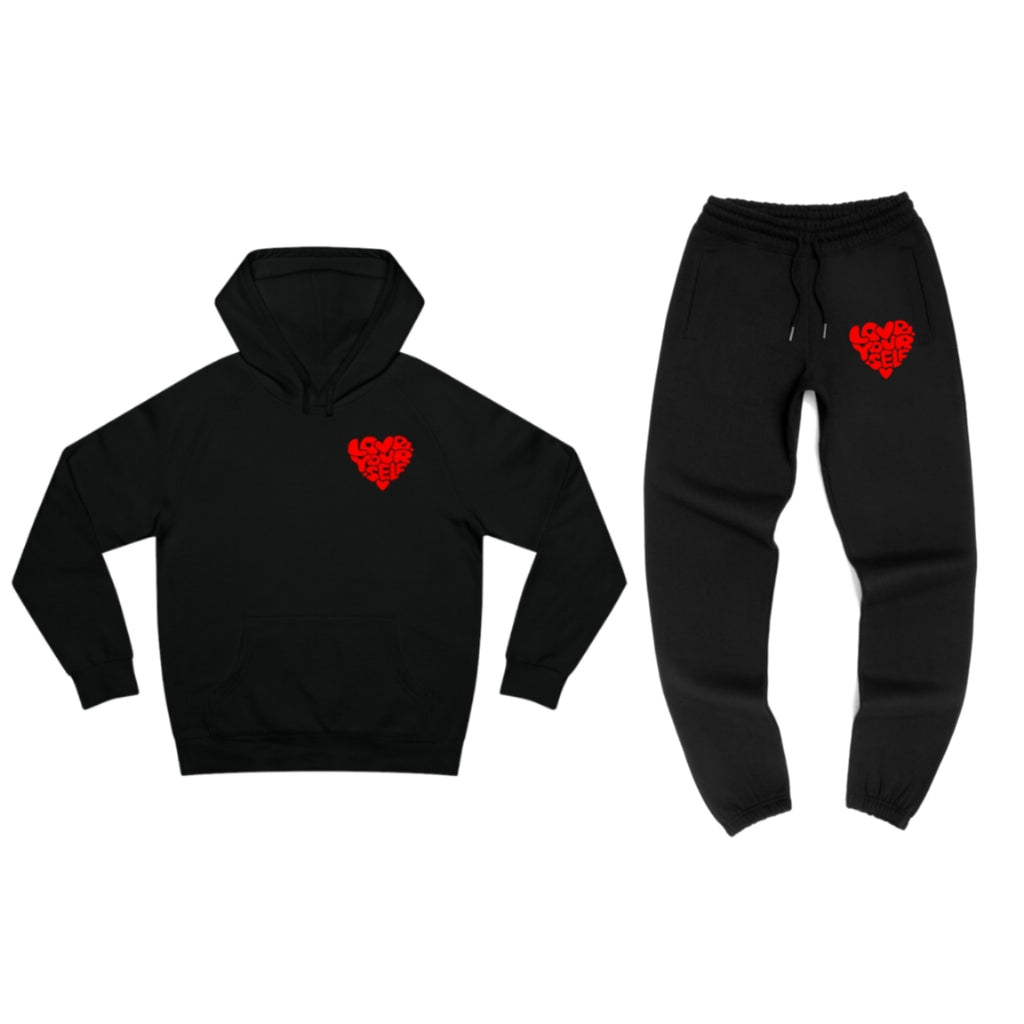 "Embrace self-love in our Red and Black Love Yourself Sweatsuit. Made with the highest quality materials, this comfortable and stylish set is perfect for a day of self-care. The perfect reminder to practice self-love, this sweatsuit is a must-have for any fashion-forward individual. 100% love yourself, 0% compromise."