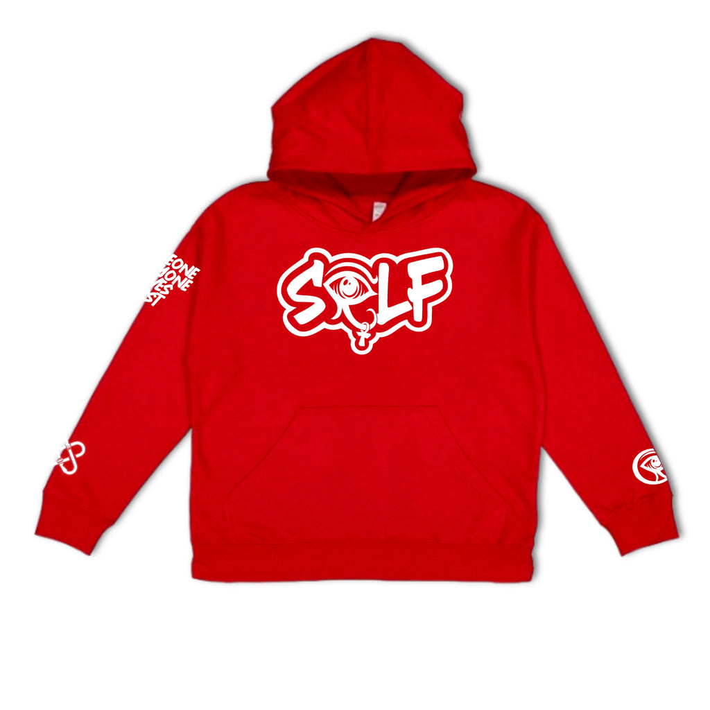Our trademark design features the color white on a premium 50/50 Hooded Sweatshirt.