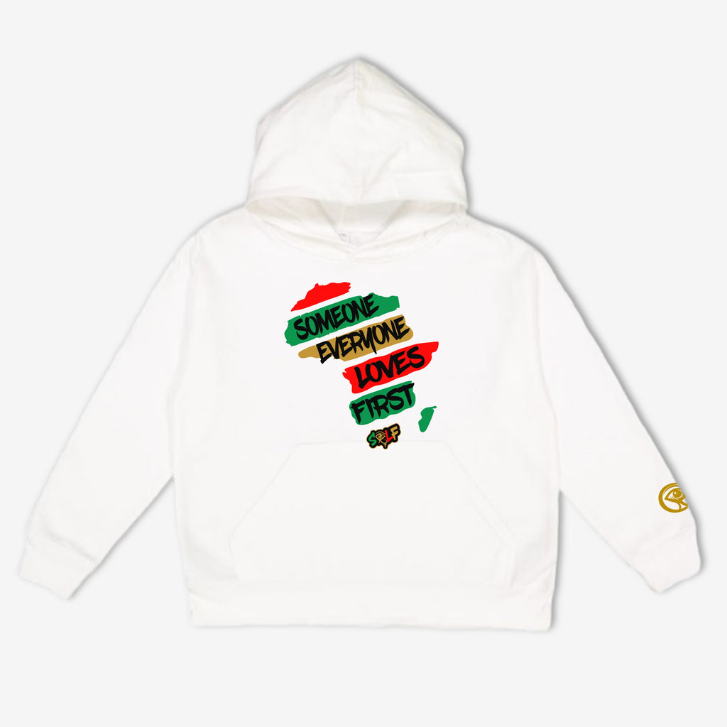 Our trademark motherland design features the color red, black and green on a the garment.